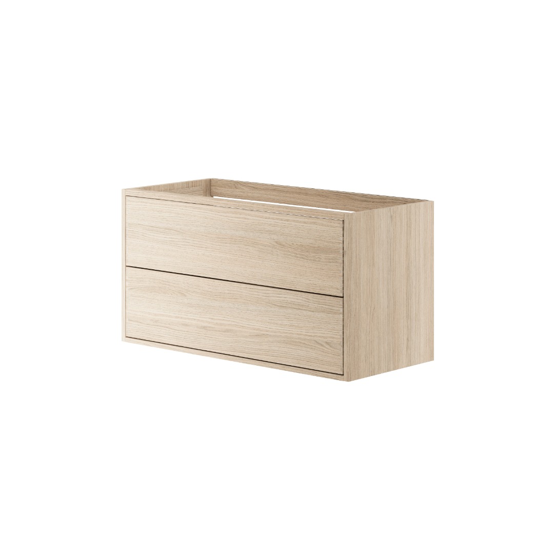 The vanity unit is made of light oak, which highlights the wood’s natural grain and gives the room a bright, friendly, and calm expression. The light surface contributes to a Nordic atmosphere, where simplicity and the authenticity of the material are at the center. Each front is carefully selected and treated so that the warm tones and structure of the oak stand out clearly without being intrusive. The top drawer has full depth without a cut-out for the basin.