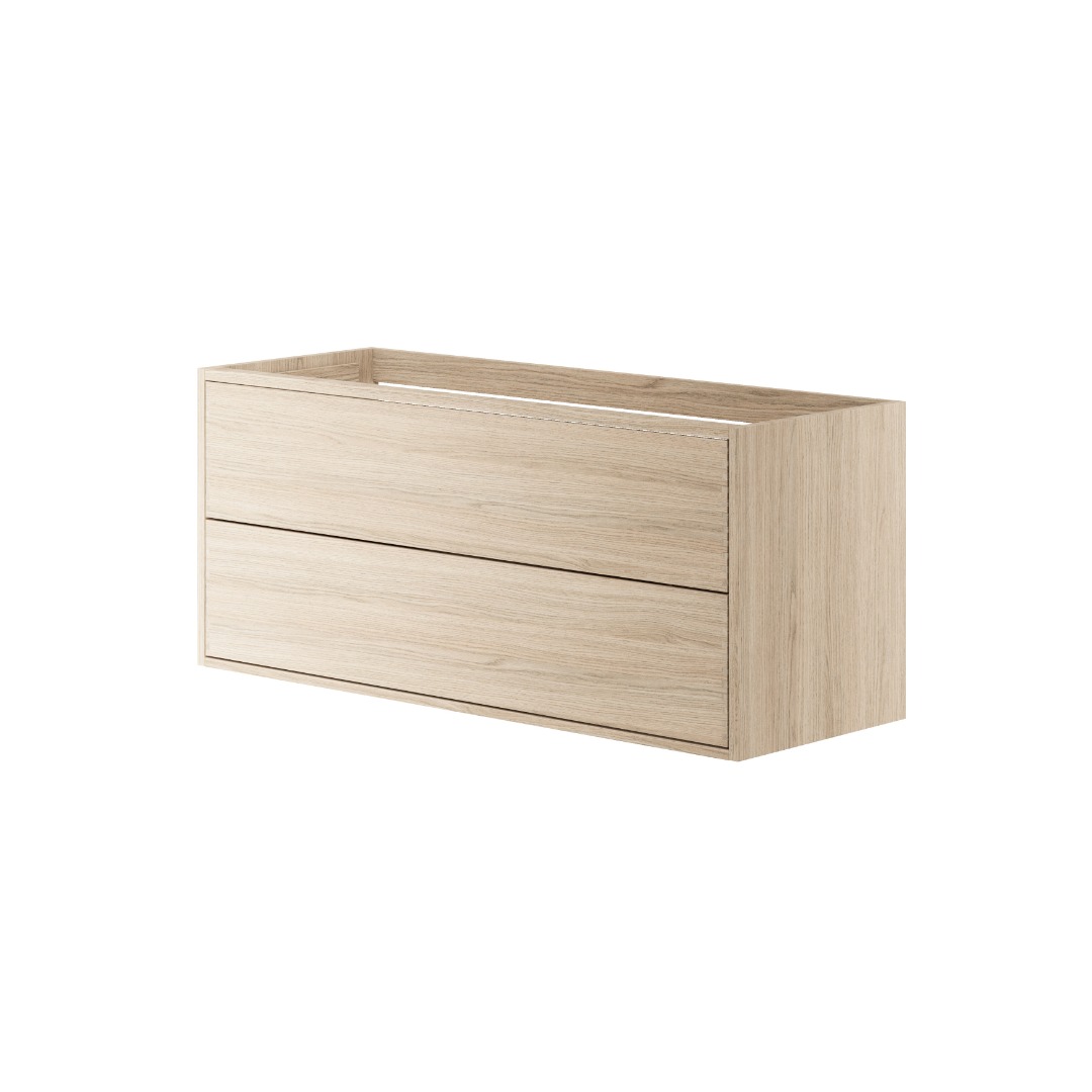The vanity unit is made of light oak, which highlights the wood’s natural grain and gives the room a bright, friendly, and calm expression. The light surface contributes to a Nordic atmosphere, where simplicity and the authenticity of the material are at the center. Each front is carefully selected and treated so that the warm tones and structure of the oak stand out clearly without being intrusive. The top drawer has full depth without a cut-out for the basin.