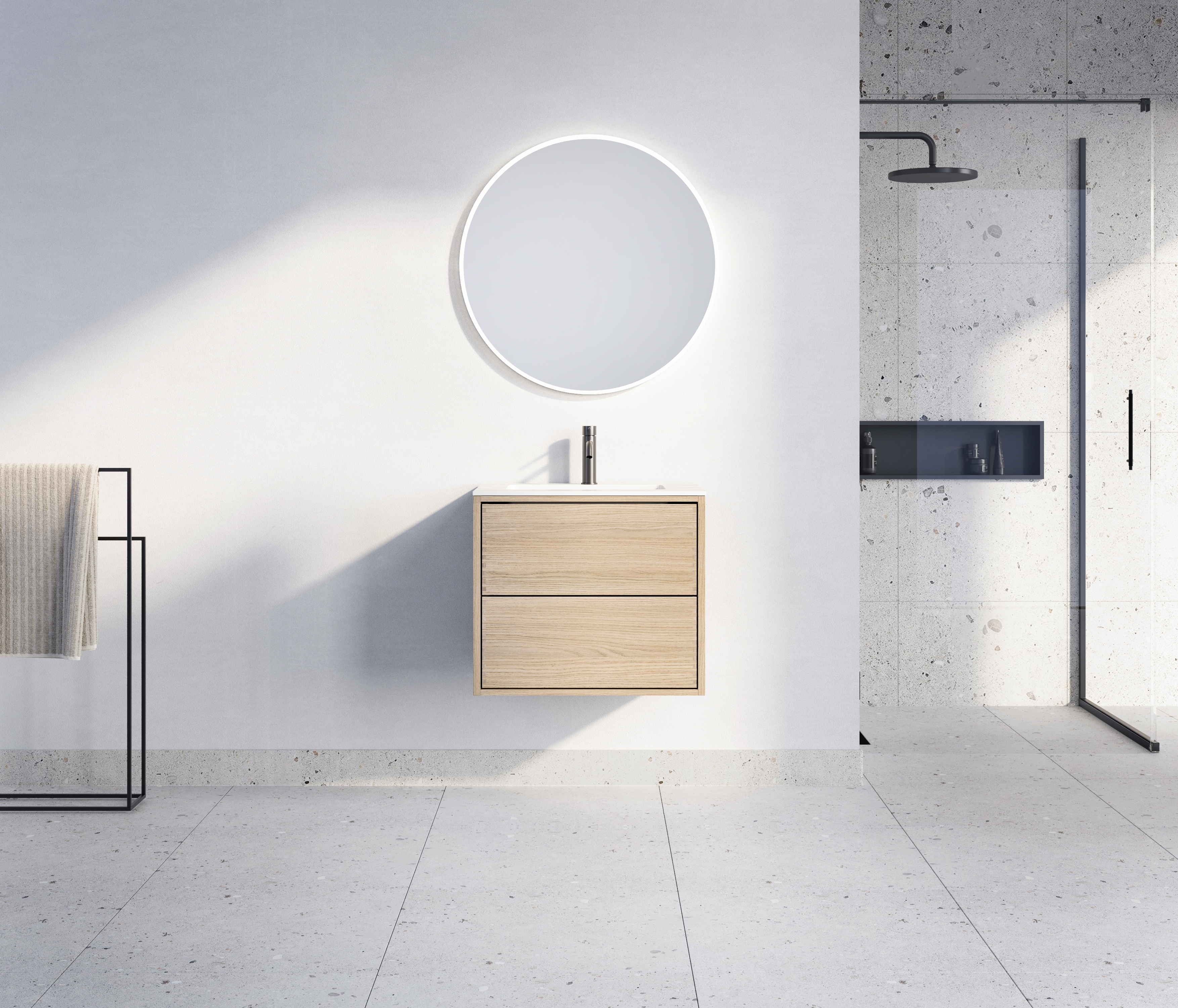 The vanity unit is made of light oak, a material that highlights the natural beauty of wood grain while adding a warm and inviting atmosphere to the room. The natural wood surface is treated to withstand moisture while preserving its authentic and organic character. This gives the vanity unit an exclusive yet down-to-earth appearance, contrasting with more industrial bathroom solutions.
