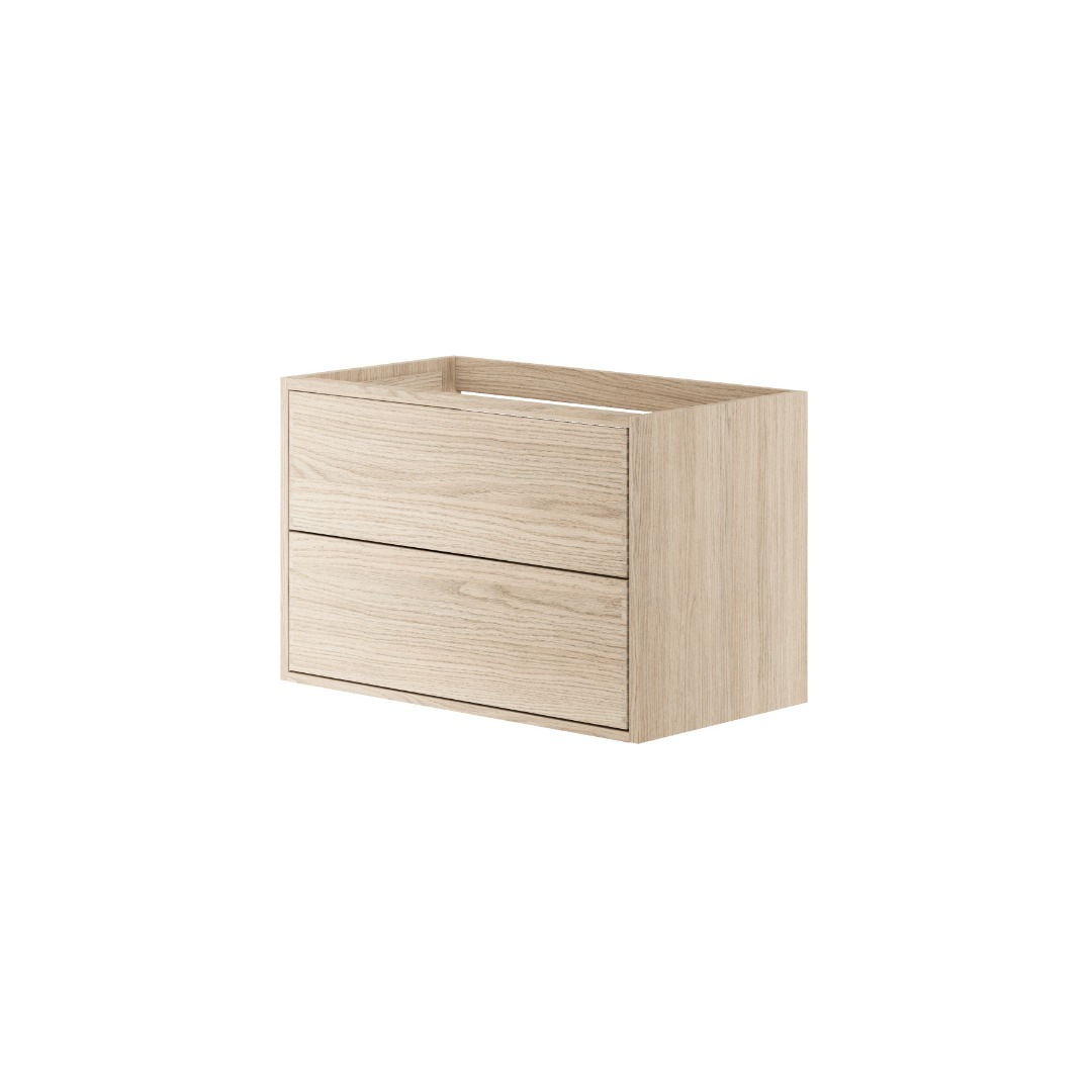 The vanity unit is made of light oak, which highlights the wood’s natural grain and gives the room a bright, friendly, and calm expression. The light surface contributes to a Nordic atmosphere, where simplicity and the authenticity of the material are at the center. Each front is carefully selected and treated so that the warm tones and structure of the oak stand out clearly without being intrusive. The top drawer has full depth without a cut-out for the basin.