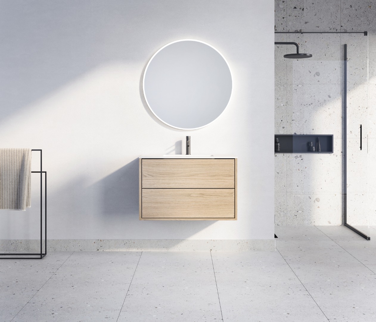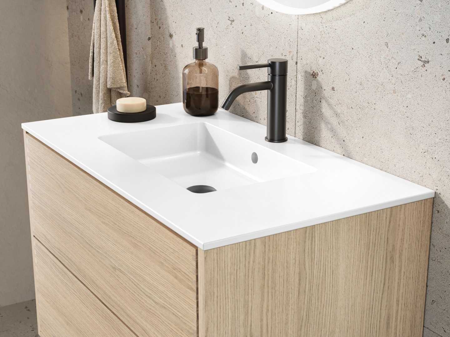 With its Nordic character, the vanity unit can easily be combined with different bathroom styles—whether you prefer a clean, minimalist look or a cozy, nature-inspired atmosphere. The light oak pairs especially well with both white and dark sinks, and can be complemented with various types of fixtures in chrome, black, or brass.