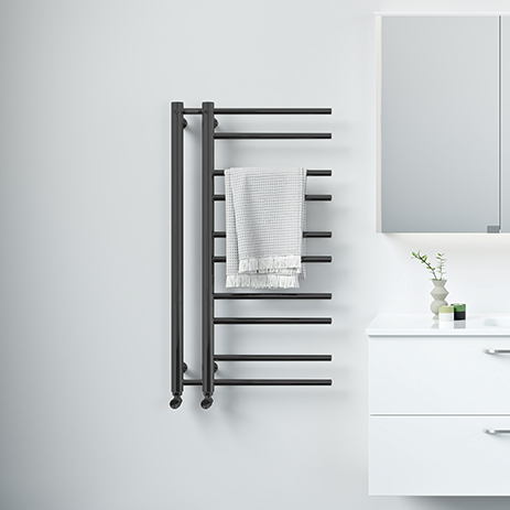 The best of both worlds – that's what Mileto's unique design offers with the combination of hooks and horizontal tubes. Hang the towels on the hooks that sit on the vertical pipes - and they dry quickly. Hang them on the horizontal pipes – so you get thoroughly heated towels when you get out of the bath. The lower hooks are perfect for small towels. Choose between two sizes and between the colors chrome or anthracite. Regardless of which one you choose, you get a unique towel warmer of the highest quality – designed down to the smallest detail.
