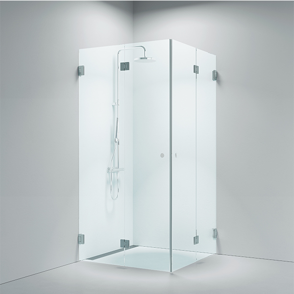 This minimalist folding door model is designed to give you extra space in the bathroom. The two doors, which meet at a stylish angle, can be opened both inwards and outwards.