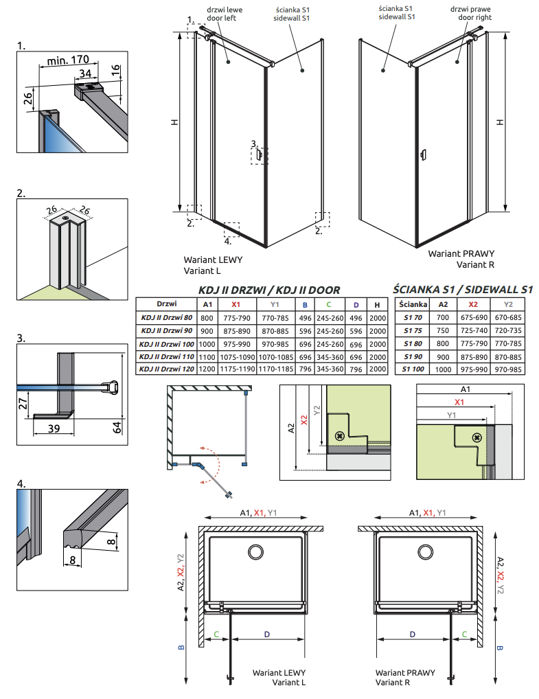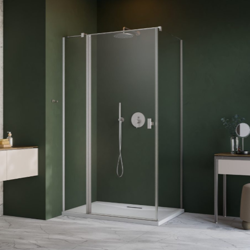 Noma 155 corner solution, 120 × 80/90/100, 6 mm glass, left model, brushed nickel profiles