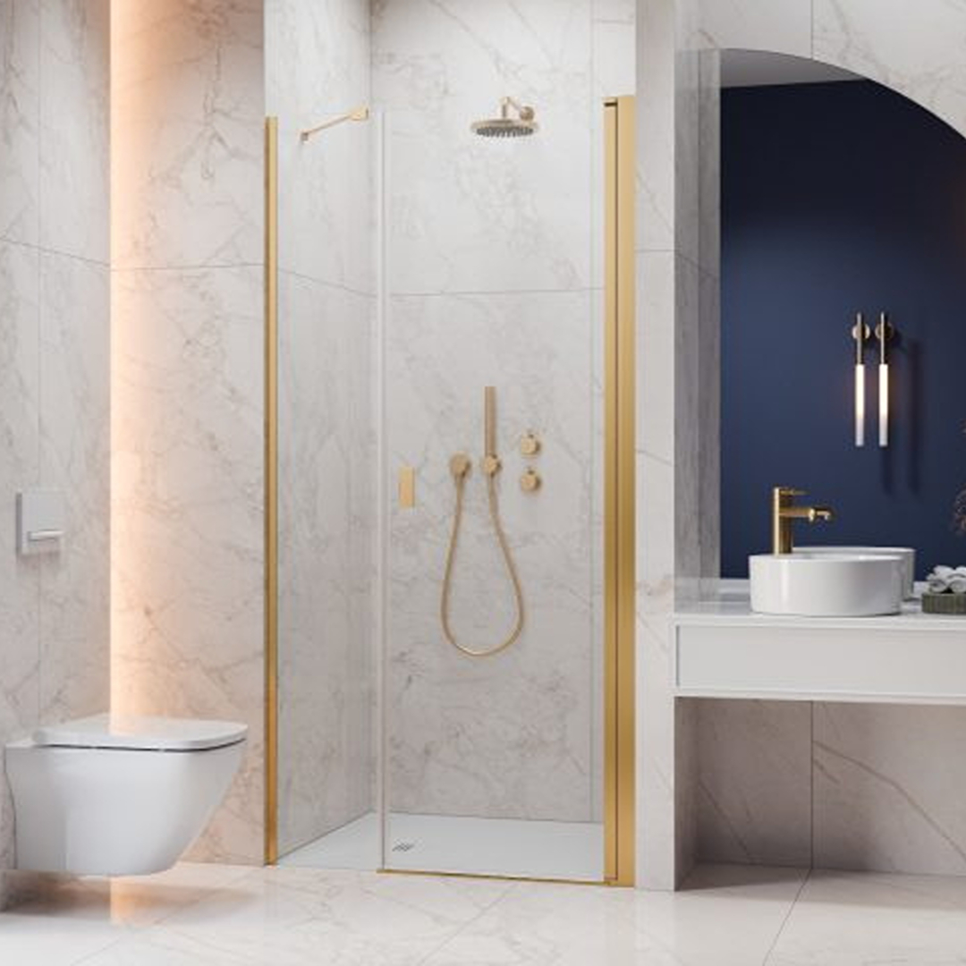 Noma 45 swing door right with side panel, 1100 mm, 6 mm glass with gold profiles