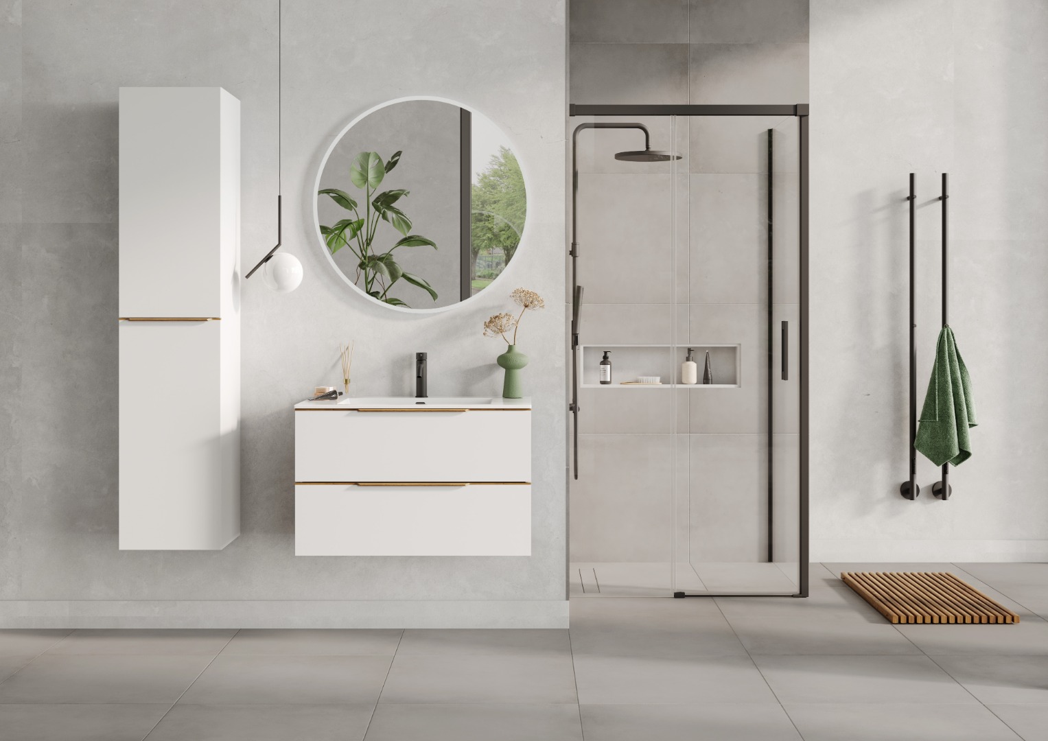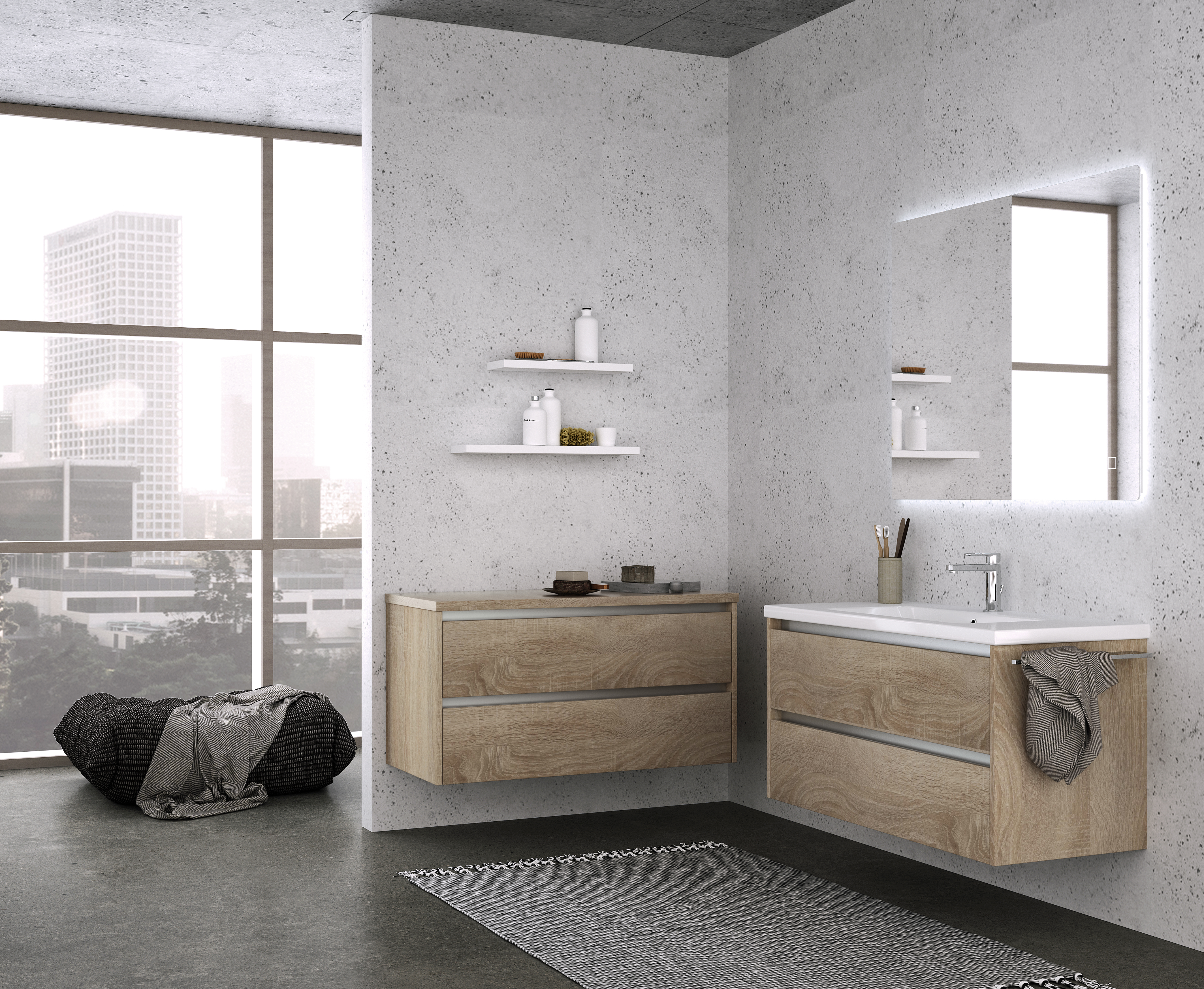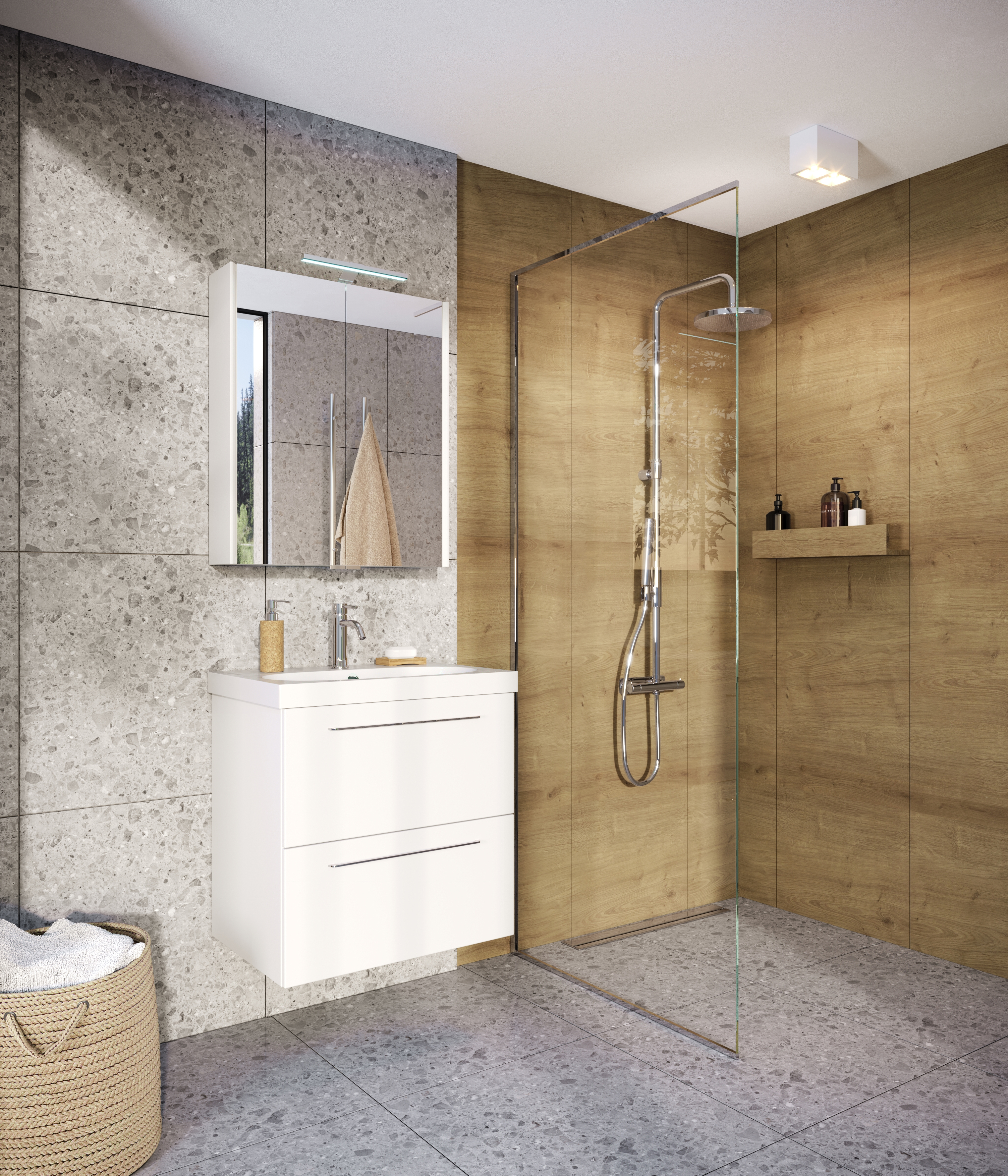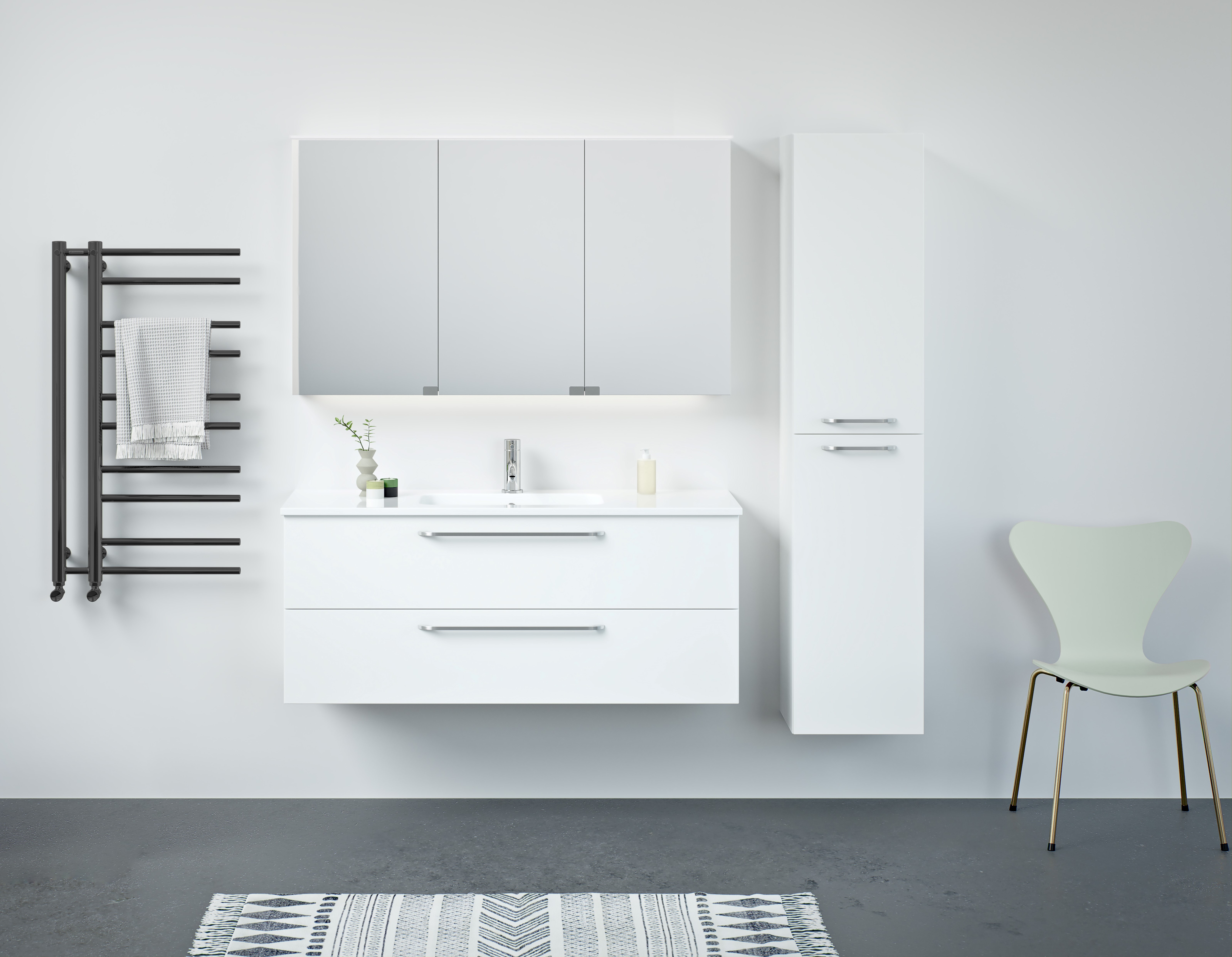 Husk å sørge for god belysning – det er meget viktig, og særlig hvis du har valgt mørke farger på innredningen. Vi har speil med stemningslys, overlys og sidelys – se utvalget her. Det kan også være smart å velge lys til skuffene – det gir god oversikt, slik at det blir lett å finne det du leter etter.