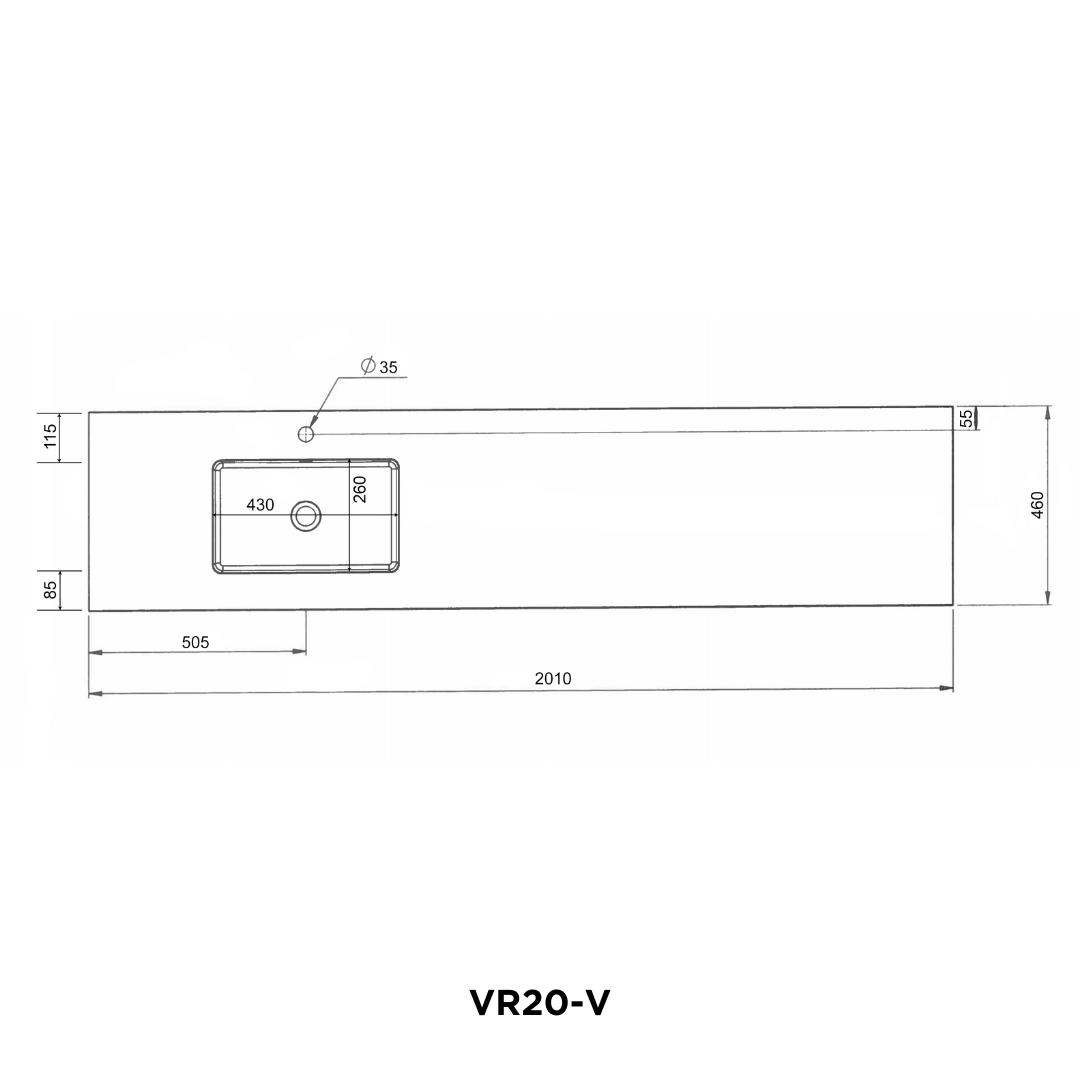 Reno Solid Surface vask, 201 x 46 x 1,2 cm, mat hvid, venstrestillet.