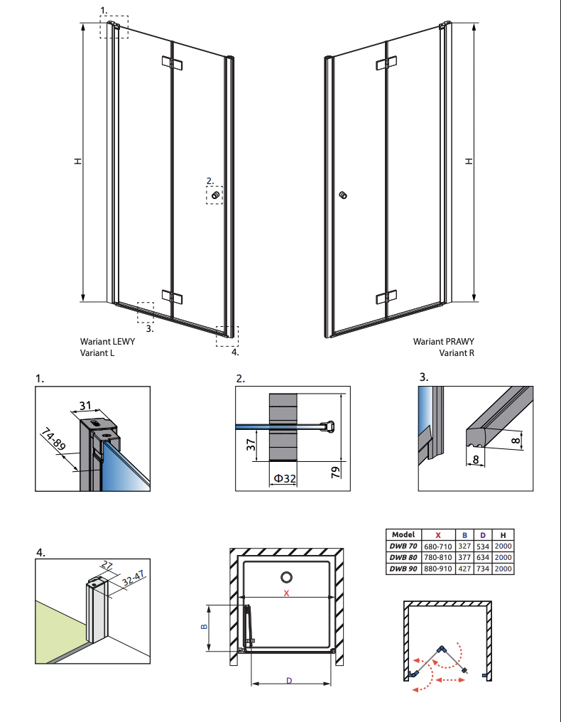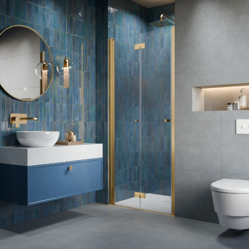 Noma 180 nischvikdörr, 900mm vänster 6mm glas, mässingsprofiler