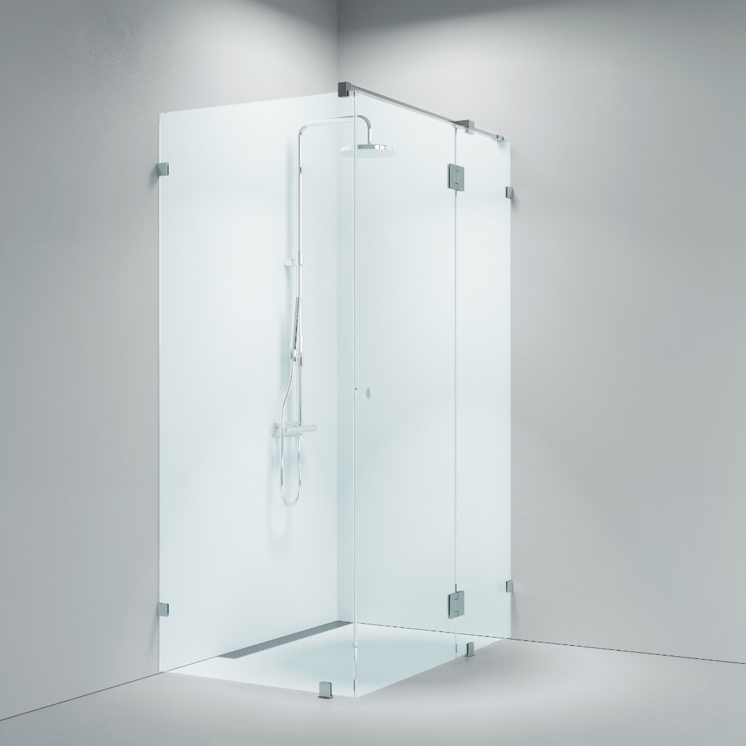 Svängdörr i glas som kan öppnas både utåt och inåt med två sidoväggar. 8 mm säkerhetsglas med Easy Clean-behandling.