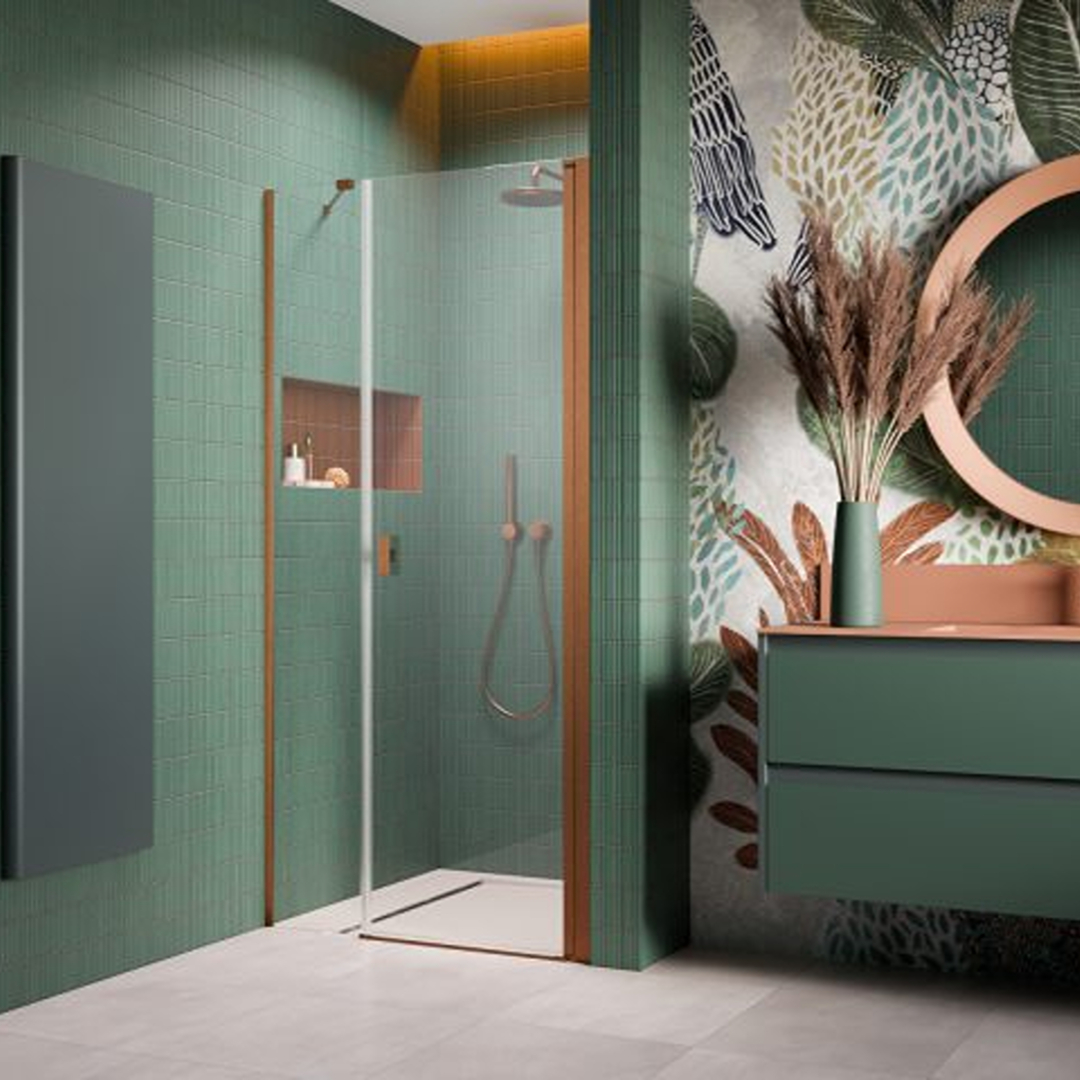 Noma 45 svängdörr höger med sidopanel 1400mm 6mm glas med borstad kopparprofiler