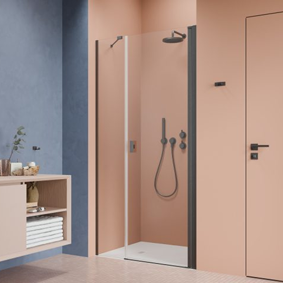 Noma 45 svängdörr höger med sidopanel 1400mm 6mm glas med gunmetalprofiler